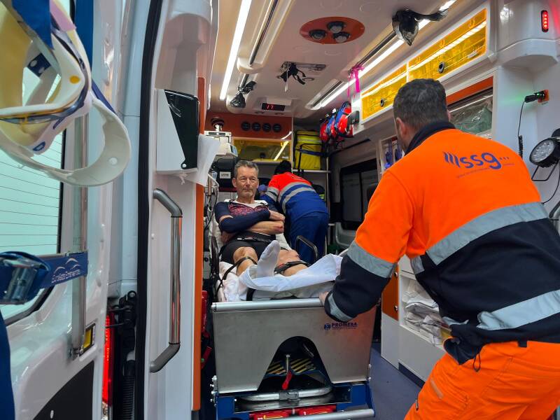Na 1 minuut komt er een pickuptruck langs die gelukkig stopt. De spanjaard helpt me overeind, maar meer dan zitten lukt niet. Ik voel meteen een akelig scherpe pijnscheut door mijn linker schouder en weet: gebroken sleutelbeen. Zo voelt dat dus bij profs die je op TV-beelden meteen hun schouder ziet pakken en hun onderarm moeten ondersteunen. Mijn linkerbeen wil niks meer. Er zit nog wel gevoel in, maar de spieren zijn niet in staat tot enige beweging. Ambulancia! De spanjaard belt 112. Het wachten duurt lang. Wat blijkt: door een misverstand met de beller kan de ambulance de plek niet vinden en is alweer op de terugweg als mijn vrouw Jessica met onze huurauto de berg op komt rijden. Na een uur op het koude asfalt word ik op een brancard de ambulance in geschoven.