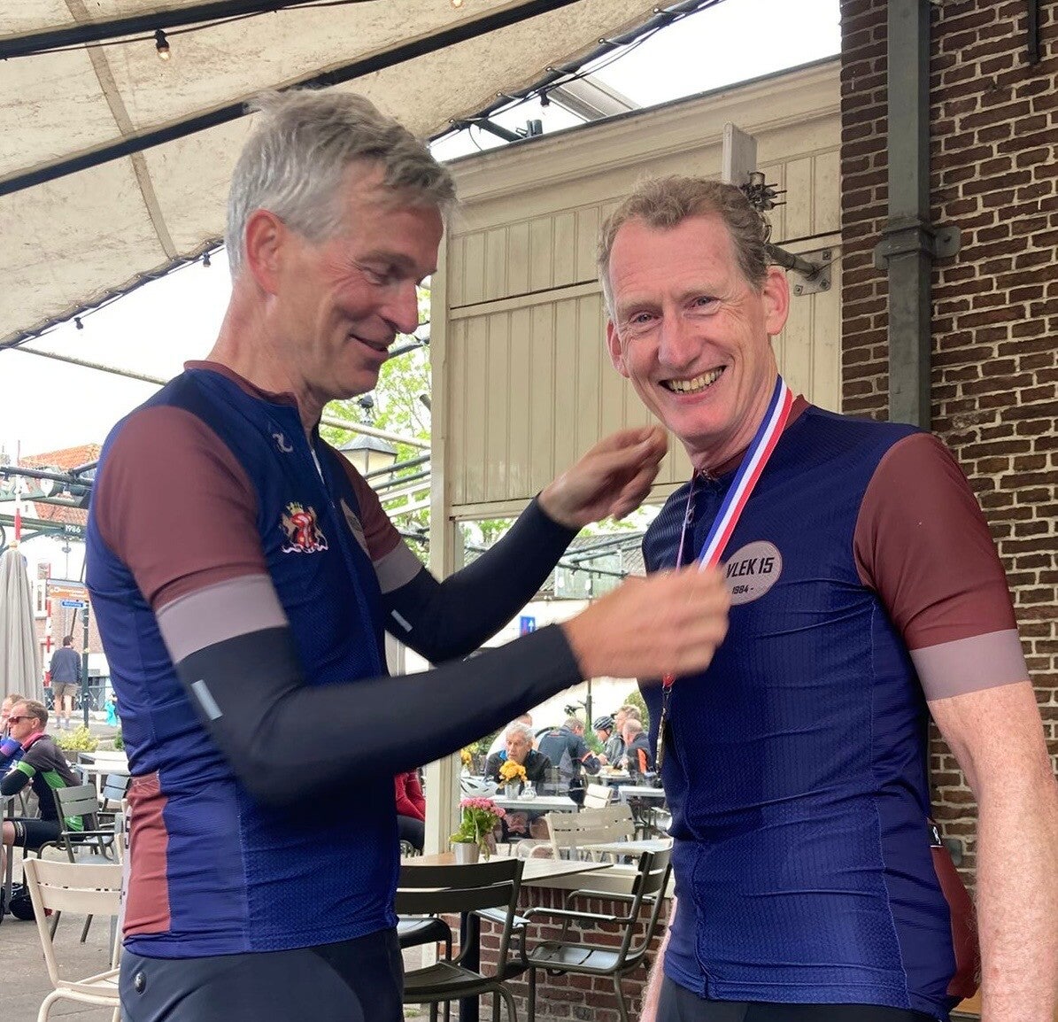 Want met rit nummer 369 was het zover: wetende dat de straal (r) van de aarde 6.371 kilometer is en dat de omtrek van cirkel gelijk is aan 2π·r heb je na 40.030 kilometer kilometer een rondje om de aarde voltooid. Een heuglijk moment op het terras in Abcoude tijdens de rit naar Ronde Hoep. Als 11e lid in de historie van Vlek 15 kreeg Dick de 40.000 KM-medaille omgehangen!