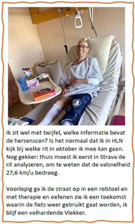 We kunnen hier niet anders dan het grootste respect voor opbrengen. Want we hebben hier niet alleen met een zeer gewaardeerd lid van Vlek 15 van doen, maar bovenal met een doorzetter-buiten-categorie. Zo deed LeoW vorig jaar in HLN-201 nog op een bloemrijke manier verslag van zijn ‘Fietsweek van drie dagen’. Want in plaats van zes dagen toeren door het Franse land belandde Leo via een snoekduik op het asfalt in een ziekenhuis in Moulins. Alwaar scans werden gemaakt van heup en hoofd. LeoW schreef daarover de volgende meesterlijke passage: