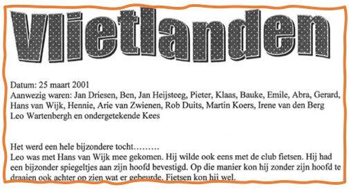 LeoW reed zijn eerste Vlek-rit op 25 maart 2001. De zogenoemde Vlietlandentocht. In HLN-86 treffen we een uitgebreid verslag van deze rit. Ik volsta hier met de inleiding. En de conclusie dat Kees het treffend heeft geformuleerd “Fietsen kon hij wel”. Waarvan acte.