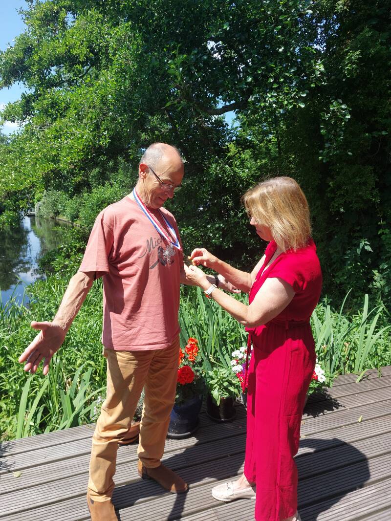 Toen we elkaar op een zonnige dag buiten clubverband troffen, in aanwezigheid van zijn kleindochter, voelde ik Leo’s ongemak over de medaille die hij nog moest krijgen, en ook zijn aanvankelijke opluchting dat er nog niet van een fysieke uitreiking was gekomen. Want wees nou eerlijk, wat doet zo’n stukkie blik er nou toe? Voor Leo hoeft dat allemaal niet.