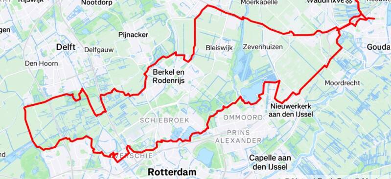 Leuk voor Jan, zijn rit kon op een grote belangstelling rekenen; Tien Vlekkers kozen dit keer voor de T25-rit. Dat is de laatste tijd weleens minder geweest. Door met het eerste stuk op het fietspad parallel aan de A12 te rijden hadden we al direct de tegenwind te pakken. Gelukkig werd er veel kopwerk gewisseld, zodat dit geen probleem was. Door mijn wekelijks fietstochtje naar Den Haag (familiebezoek), voor mij geen onbekende route. Bij Zoetermeer lieten we de snelweg achter ons liggen en werd het (voor mij) minder bekend. En dat zou voor een groot deel van de rit het geval zijn. Ik heb inmiddels ruim 432 Vlek-ritten op mijn naam staan, maar ik kan wel zeggen dat zeker 60 procent van deze rit voor mij onbekend terrein was en dat terwijl we hemelsbreed niet meer dan 30 km van Gouda verwijderd zijn geweest. Kan natuurlijk ook aan mijn geheugen liggen, maar ook dat weet ik niet meer. Wat zeker opvallend was dat het een groene route was; voor een groot deel reden we in landelijk gebied, zoals de Ackerdijksche Plassen, met de afgelopen tijd 238 vogelsoorten een rijk natuurgebied en dat in het stedelijk gebied dat de Randstad kenmerkt.