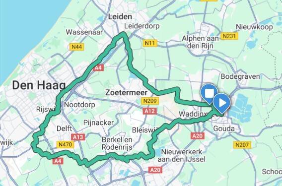 Soms zitten je weekends vol afspraken. Ik keek uit naar de rit die Einte had voorbereid en als je de kaart bekijkt begrijp je me. Via Benthuizen reden we langs de Vliet en om Delft heen richting Gouda. Wat een zegen, op de terugweg stond die 7 Beaufort in ons voordeel.